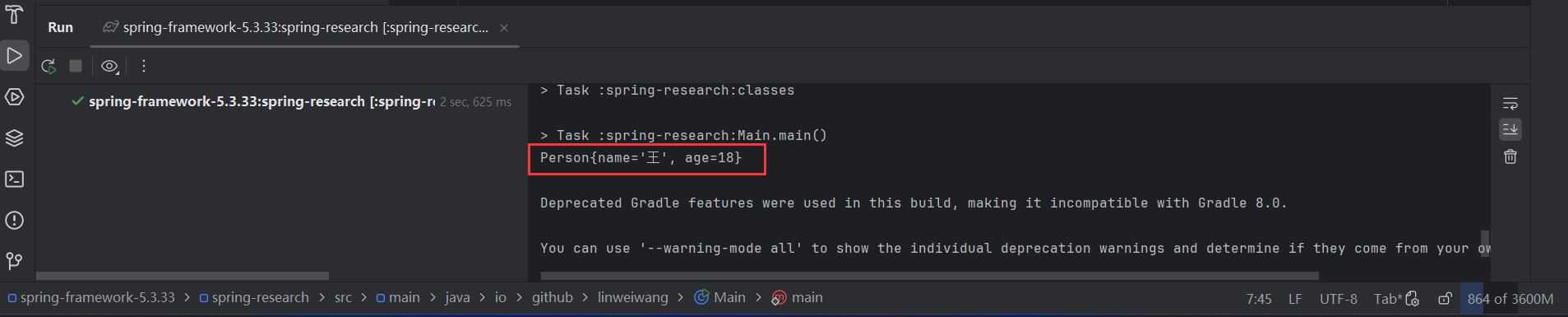 1 2 3 4 5 6 7 8 9 10 11 12 package io.github.linweiwang;import io.github.linweiwang.bean.Person;import org.springframework.context.support.ClassPathXmlApplicationContext;public class Main { public static void main (String[] args) { ClassPathXmlApplicationContext context = new ClassPathXmlApplicationContext ("spring-config.xml" ); Person person = context.getBean(Person.class); System.out.println(person); } }