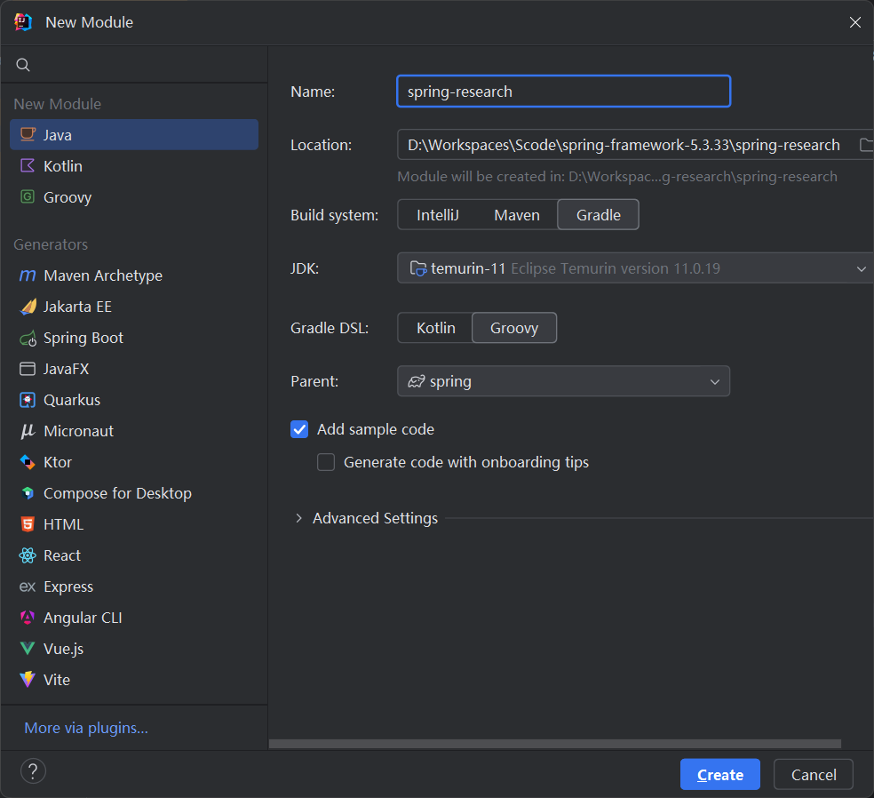 新建测试 Module 通过 gradle 新建一个 module,取名为 spring-research